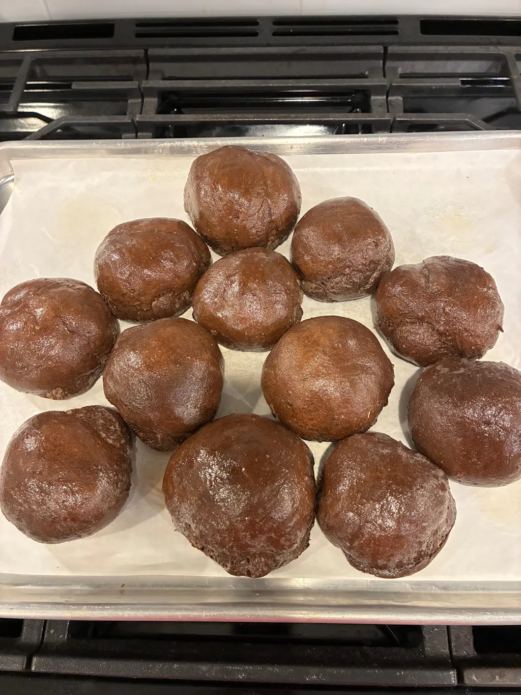 - Let these buns rise covered (preferably in a proofing bag) in a warm area until they double in size. If you have a cool kitchen, it will take an hour or more. When they have risen, bubbles begin to form under the dough skin. If blisters form, pop them with the point of a knife and hurry them to the oven.