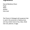 Ingredients: Natural Blackberry Flavor, Sugar, Water, Alcohol, and Citric Acid. This product is packaged in a facility where baking mixes are produced and may contain traces of soy, dairy, wheat, tree nuts, peanuts, or eggs.